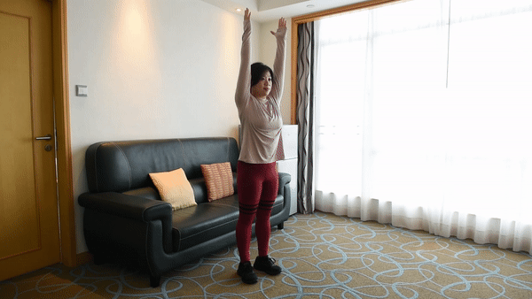1. 站立軀幹挺直,雙手放耳旁,打開手肘