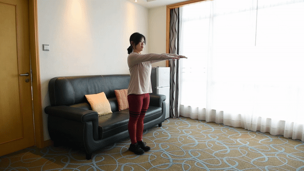 1. 雙手由身軀兩旁向前伸,雙腳交替踏前同時雙手向後拉