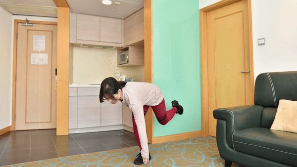 1. 手放在牆或固定的物件上,伸直腳令身體成一直線,往後踏一步
