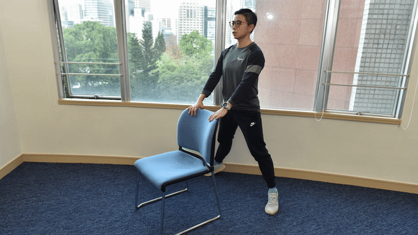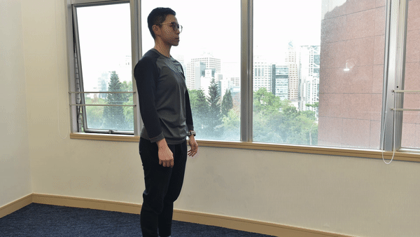 1. 手扶牆或櫈,雙腳打開與肩兩至三倍寛,腳趾朝外45°,保持腳跟離地