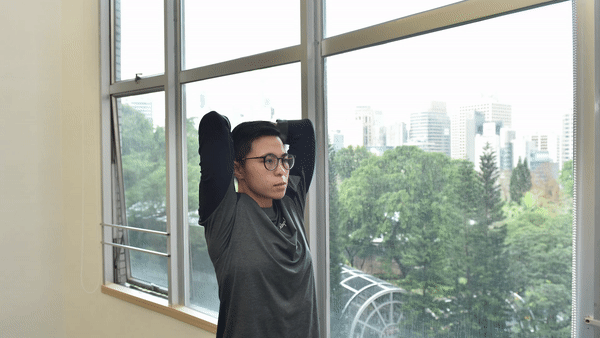 2. 曲肘令拳置於頭後,避免手肘打開向外,伸直手還原